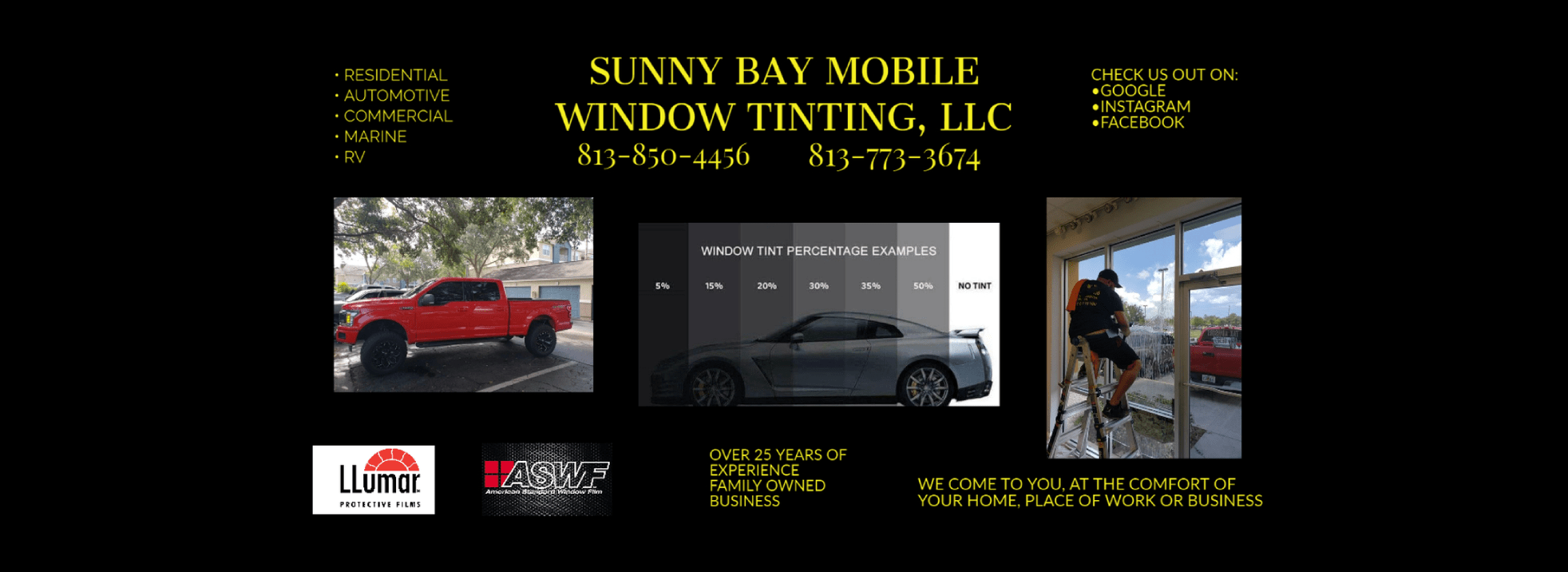 Sunny Bay Mobile Window Tinting is a professional window tinting company located in Spring Hill, FL, and servicing the surrounding areas. Whether you're looking to tint your vehicle to extend the life of the upholstery or reduce the heat in your home, you will need us to get the job done properly. We specialize in automobile tinting, security film installation, residential window tinting, and commercial window tinting. Additionally, we also remove old window films to correct prior glass tinting jobs. If your windows are bubbling or falling off, we can also save the window defrosts on the cars when they're scraping against the exterior. We can work with most types and sizes of vehicles, from small compact cars to large trucks. Our mobile window tinting service provides the services you need at your convenience. You can count on us to provide you with high-quality window tinting at an affordable price.